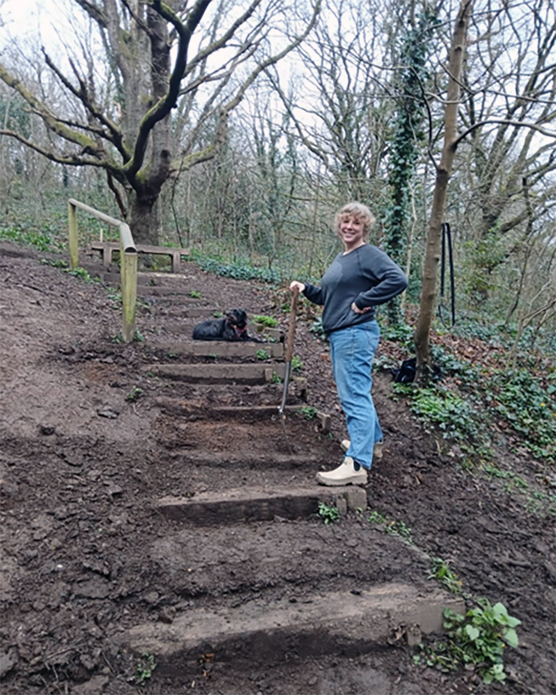 The lovely Leah cleared debris, earth and decomposing leaves from the wooden steps that lead down to Packhorse Bridge, assisted by fluffy butt, Flo.  The steps are now more accessible.  Later in the year, we aim to install new wooden rails to replace those that were thrown in the brook.