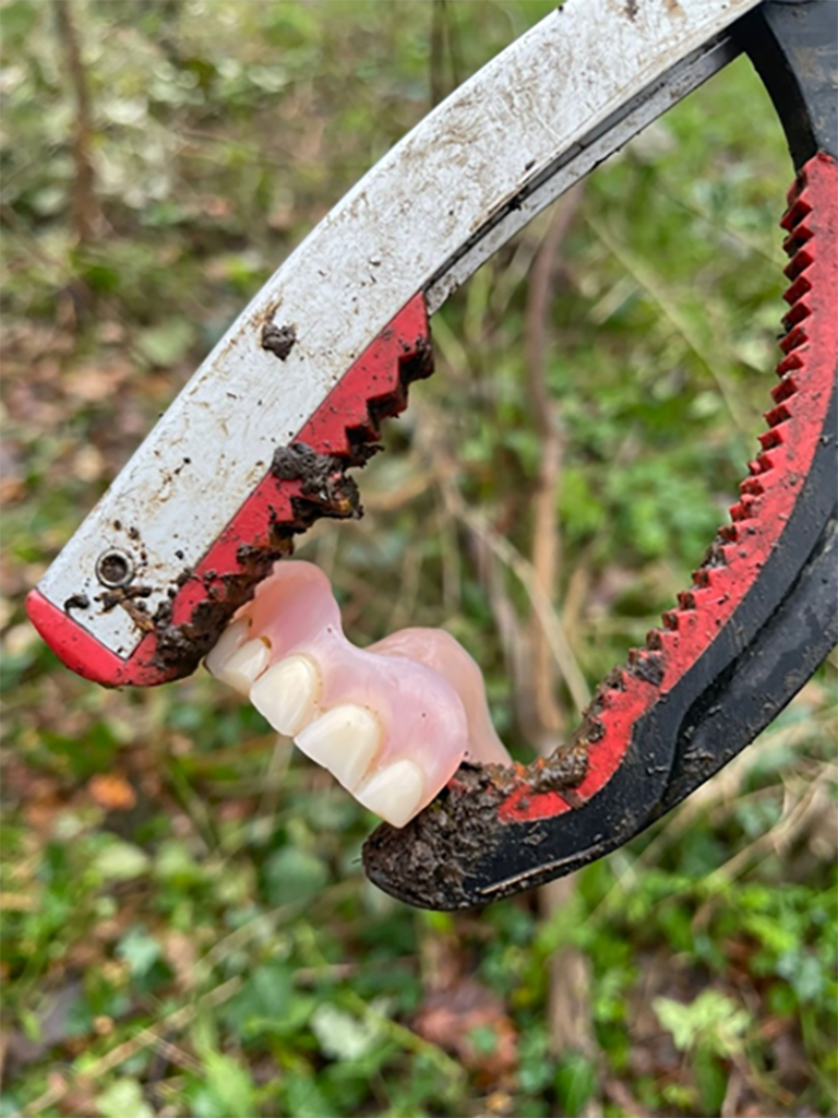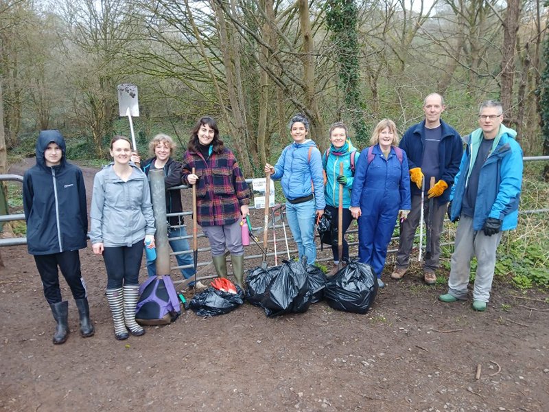 It was a beautiful early spring morning on Sunday 9th March, chilly but bright, and the sun was dappling through the trees.  It was a pleasure to be in Nightingale Valley.  The primary focus of the work party was bramble bashing.  A group of us set about tackling the brambles that have taken hold near the electricity pylon at Packhorse Bridge.  It’s amazing what you find in the hidden space beneath the brambles.  One of us unearthed half a pair of false teeth!  The question is, how did they get there?  Did someone trip over causing their dentures to catapult out?  Or, was it the result of a coughing fit?  I guess we’ll never know.   We also found a curler.  Whoever goes out wearing their curlers?  Very Hilda Ogden.