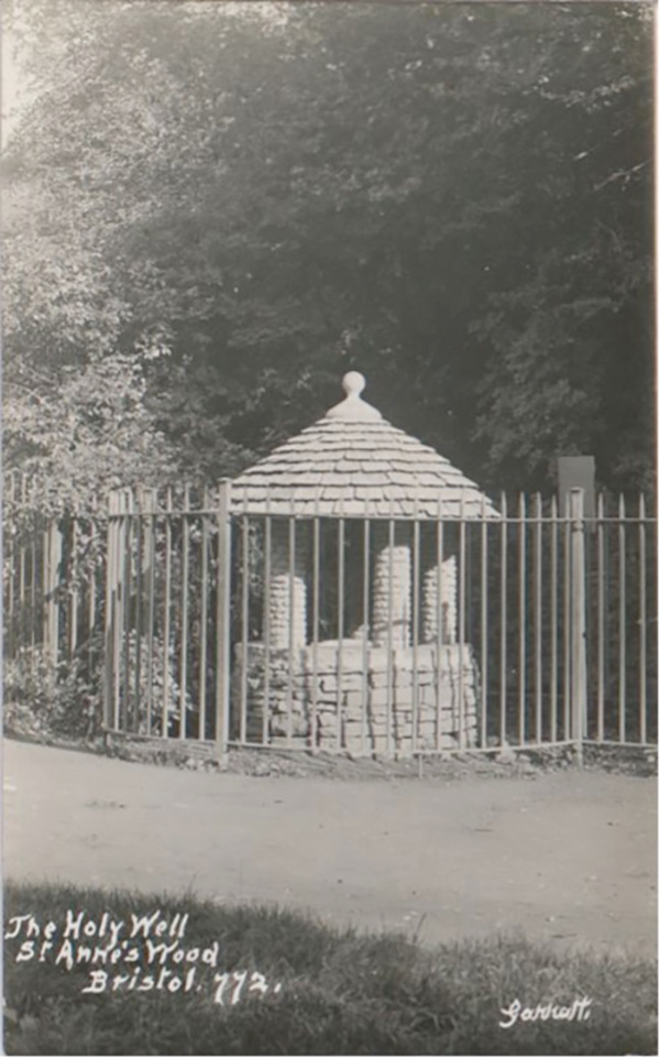 A sepia photo of a small well with a tiled roof, behind an iron fence. Annotated "The Holy Well, St Anne's Wood, Bristol. 772"